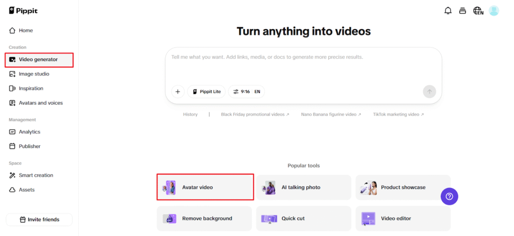 To start using the tool, you need to log in to Pippit and click on the option ‘Video generator’ from the menu on the left. Under the Popular tools option, click on ‘Avatar Video’ and use this option to view and create avatars for your video content. Avatars are tools that are great for syncing your video voiceovers with your facial expressions. Select the avatar that suits your video content the best.