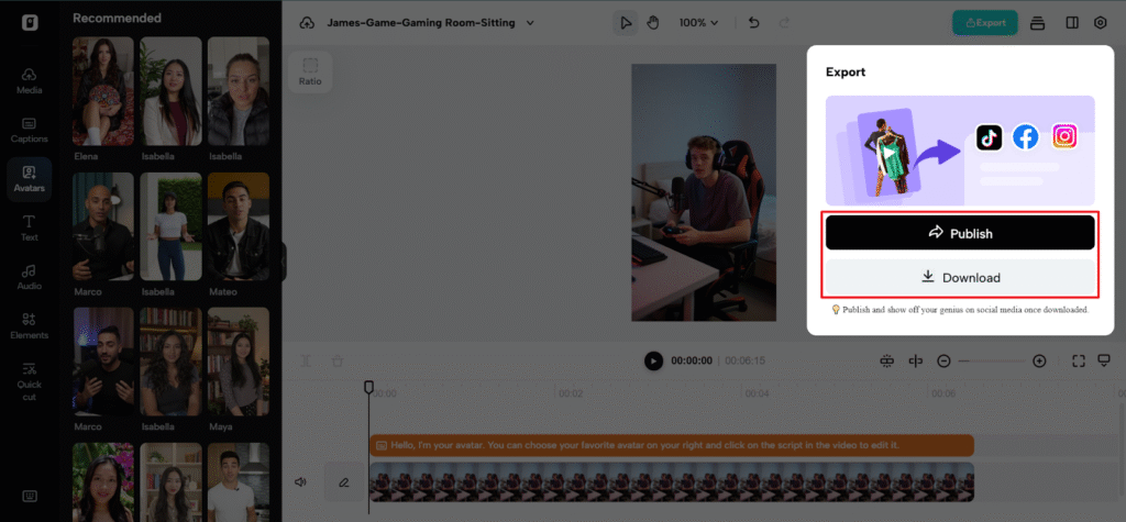You may edit your audio, face, and other features, such as text or background audio. If everything is ready, you may then click ‘export’ to download your video or share it on social media sites such as TikTok, Instagram, or Facebook. You may also use their Analytics tool to monitor your performance to improve your future support videos.